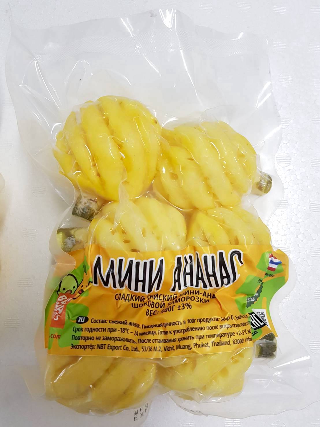 Fresh ripe Thai mini pineapple. Clean and peeled, ready to eat. Frozen using Individual Quick Freezing technology.